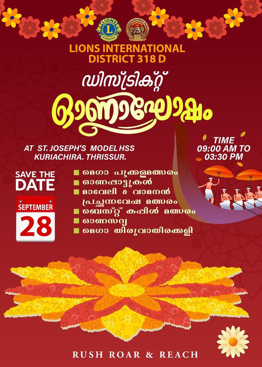 We, the DG Team and the CORE Cabinet invites all the lion leaders and our dearest lions for the District Onam Celebrations to be held on 28th September 2025 at St Joseph Higher Secondary School Kuriachira.